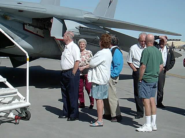 Reunion attendees waiting to inspect a Navy Tom Cat.