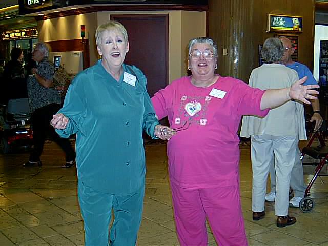 Judy Stotts and Polly Ricksecker welcome arrivals to dinner at Harrahs.