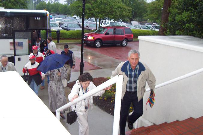 Ralph Link and Ann Gagnon near the top of the stairs at the Carolina Opry Theatre while other association members are exiting one of the buses.