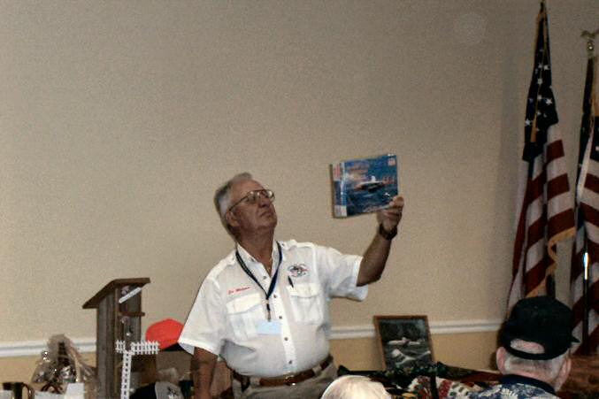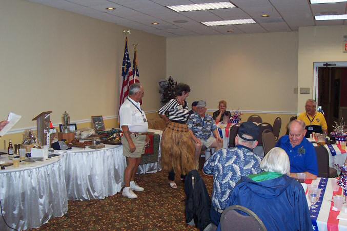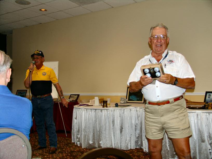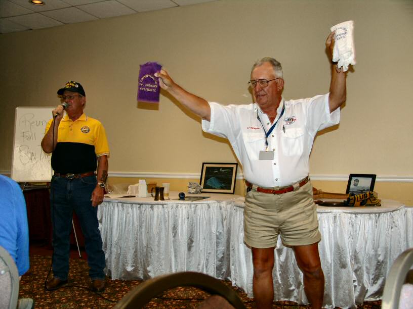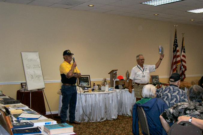 Ed Metzger holds up a set of VW-1 monogramed hand towels while Gary Oulman calls out the bidding.