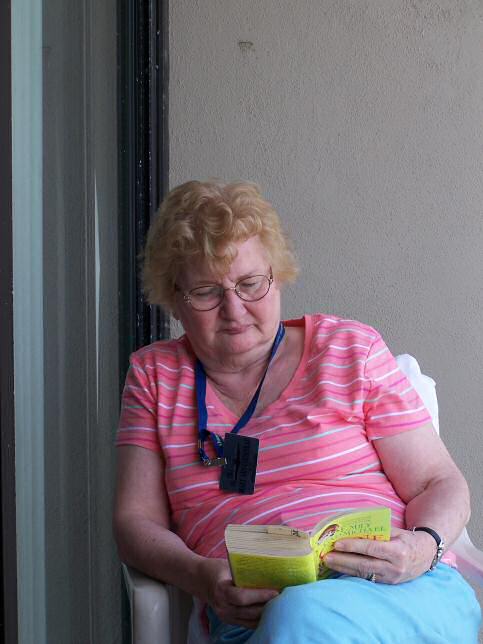 Mary Ann Cousineau takes time out from the reunion activities and relaxes on the room
