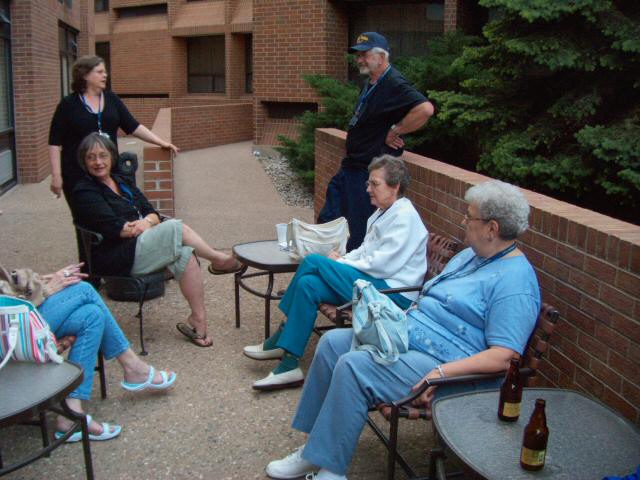In the background Nancy Stinson is talking with Lowell Buswell, the two ladies sitting opposite each other are