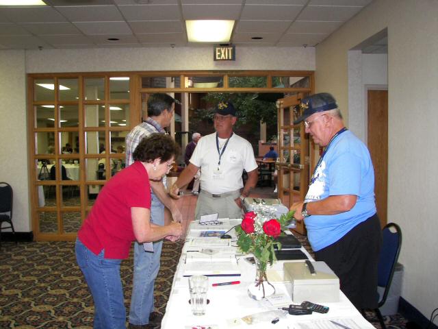 In the forground, Gay Oulman assists Ed Metzger at the registration table. In the background Gary Oulman extends his hand to welcome