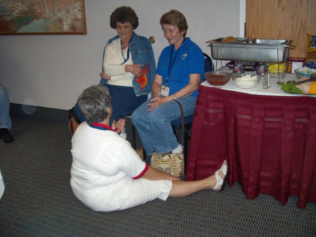 Gay Oulman and Jane Link who had been looking at San Diego reunion pictures on a CD, pause a moment for a picture.
