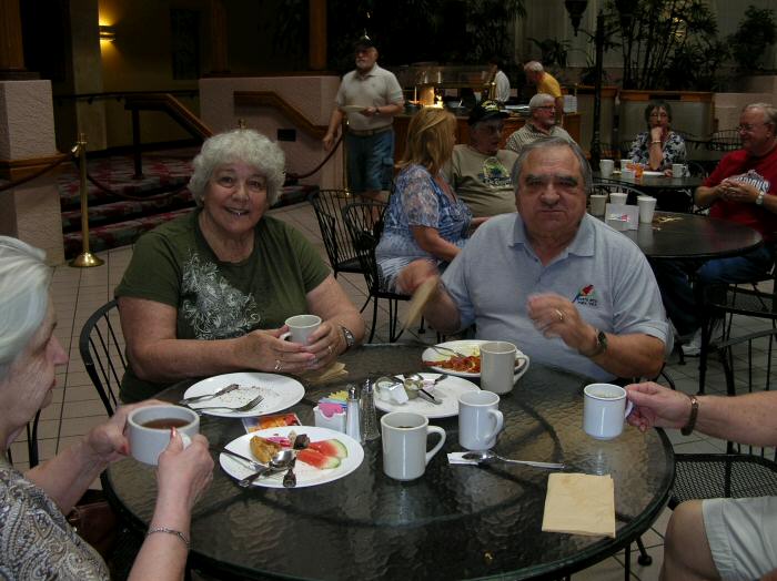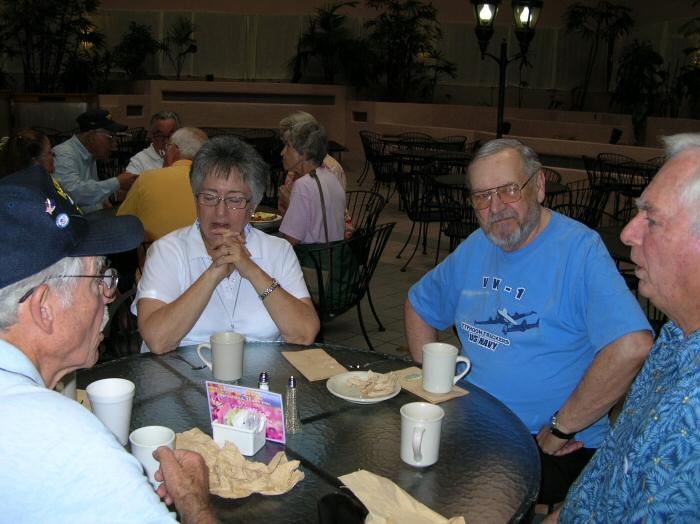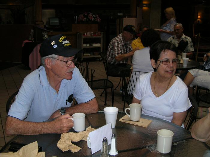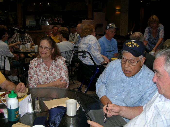The 4th. picture, from the left: Steve Davis shows Phil Rivera photos on his laptop, Kathy Davis converses with others across the table.