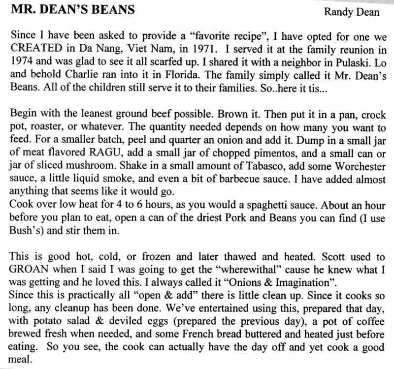 George Dean's receipe (Mr Deans Beans) that he made up while in