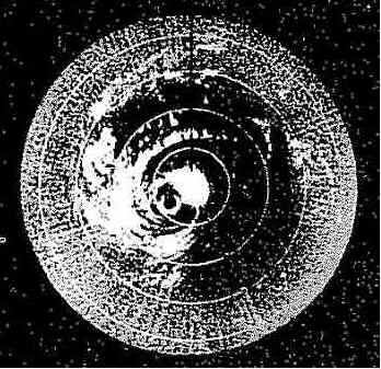 A radar presentation of tropical storm Patsy in the Philippine Sea. The eye clearly shown as a crescent near