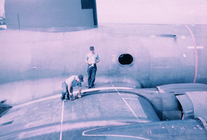 115/145 Avgas from the wheel well fuel sump drain. On deployment, NAS Cubi Point 1959.