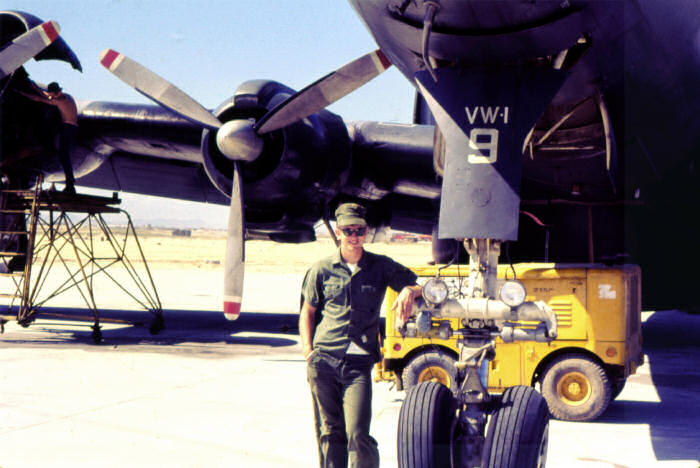 3rd picture from left: Getting ready to hang the prop on #3 engine of one of VW-1's WC-121 aircraft. Chu-Lai