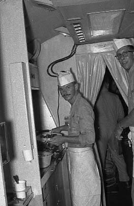 Pictured 3rd. from the left: Unidentified crewmen cooking meal for crew in EC-121.