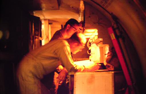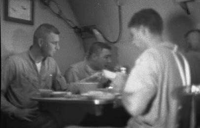 Pictured 2nd. from the left: Buster Tipton AG3, Vic Callison AT2 and another CIC operator at aft chow table