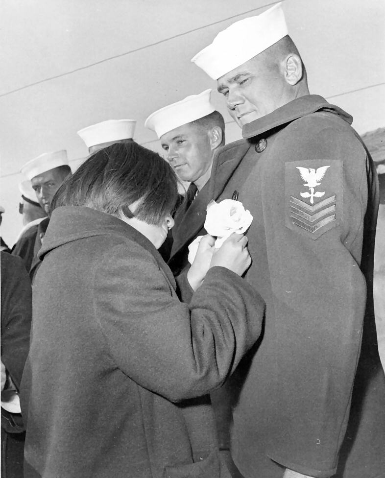 The 2nd. picture: Dick Lee, TE-6's flight engineer has a flower pinned to his pea coat.