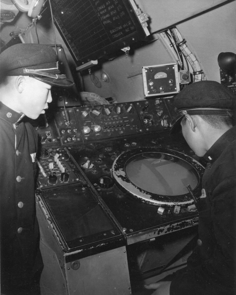 Pictured 3rd. from the left: 1965: Radar techs Pete Wasmund and another radar tech. troubleshooting a problem