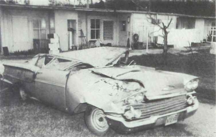 THIS 1958 VINTAGE HARDTOP CONVERTIBLE (right) was picked up by Typhoon Karen and deposited in the back-yard