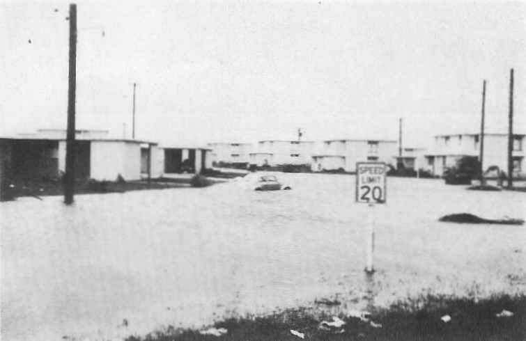 ENLISTED MEN'S HOUSING (left) at NAS after typhoon Karen inundated the area with wind and water. Un-