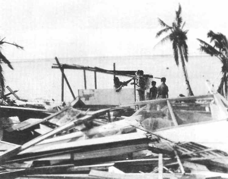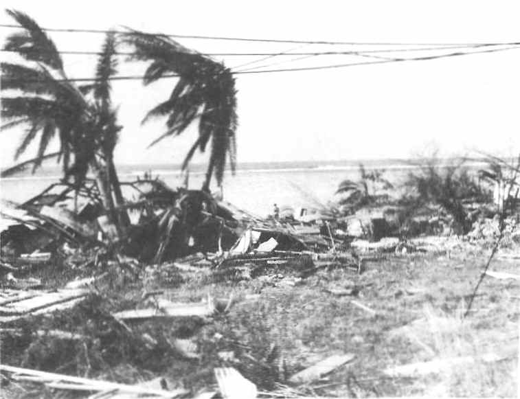 THE DAMAGE TO LOCAL GUAMAINIAN HOUSES is graphically shown by the total ruin of these two dwellings. Scenes such as these are tragically typical of what happened to a large precentage of the houses on the island. It is estimated that 90 percent of all the civilian housing on the island was damaged to various extents. (ComNavMar Photo)