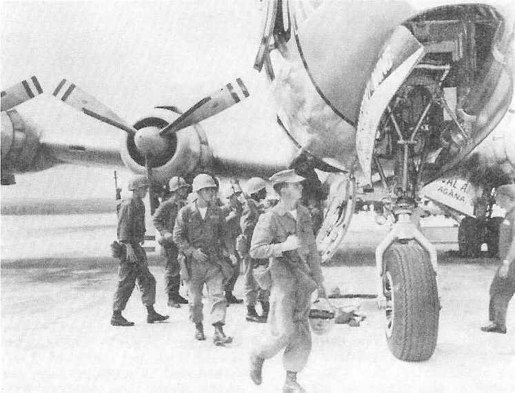 FIRST ELEMENTS of Mike Company, 3rd Battalion, 4th Marines debark at NAS on their mercy mission to Guam. The men played a major role in the setting up of field kitchens in hard hit villages and were part of the preventive medicine team which admisistered typhoid vaccine to local citizens. (ComNavMar Photo)