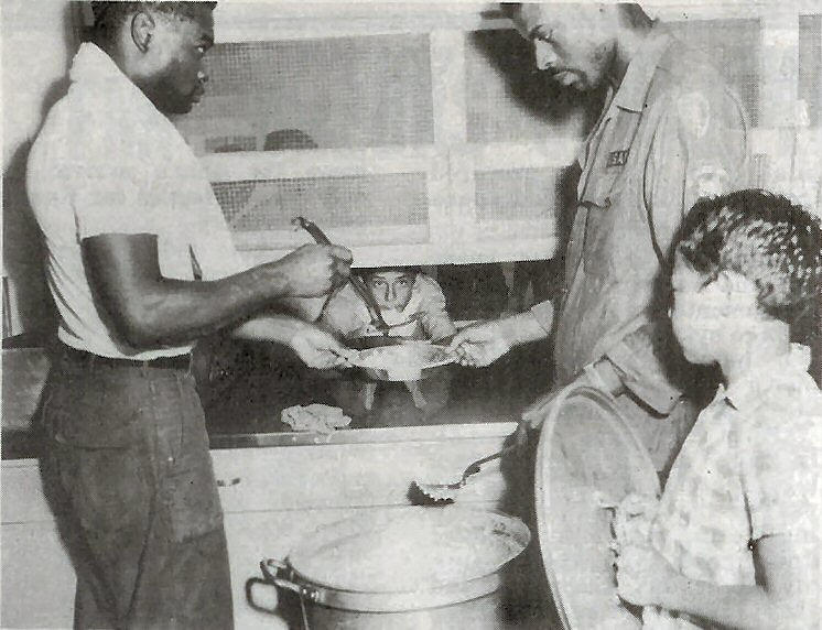 kitchen set up in the school. Working the line are (L - R) SP-4 Edward Black, SP-5 Charles Williams and