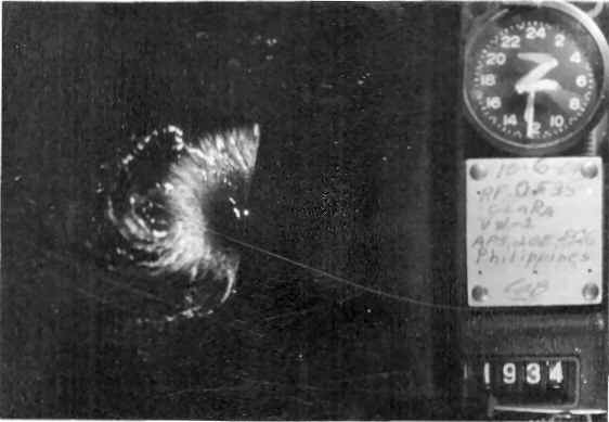 - 1st. picture from left: Typhoon Mary as seen on EC-121 camera scope. The 50 nautical mile range markers