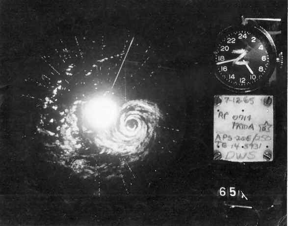 3rd picture from left: Typhoon Frida as seen on the camera scope of the EC-121 during a mission on Aug. 12 1965
