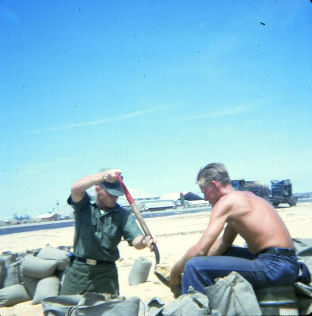 - Pictured on the left is a couple of the VW-1 ground pounders filling sand bags for the bunkers. You can