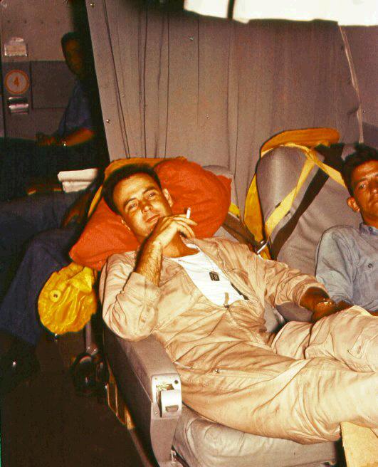 Sea stories helped pass the time during the long flights. LCDR Pressler in seat facing camera.