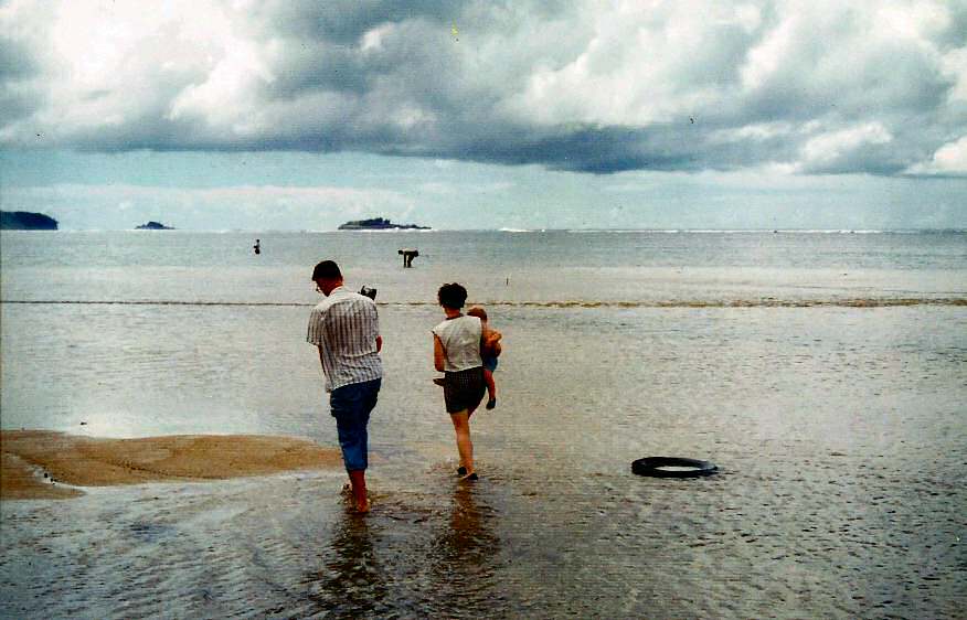 2nd. picture from the left: Pete and Dottie Wasmund with oldest child walking the beach of Agat on Guam