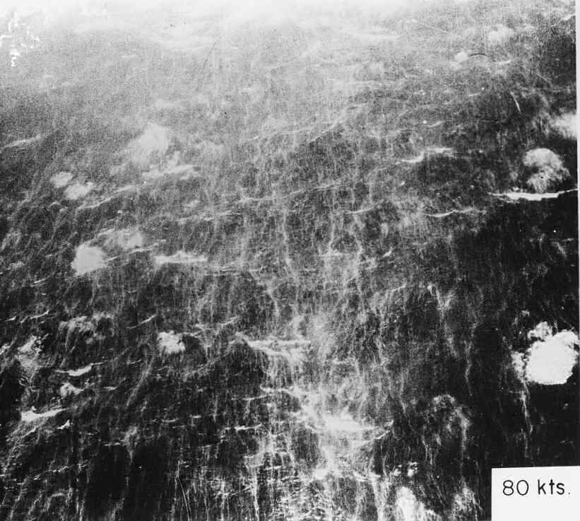 This series of pictures were used by the Meteorologist and Aerographers as a reference to estimate surface wind speed conditions. Since most VW-1's storm penatrations and fixes were during the night time and at low altitude the aircraft landing lights were used on occasion to make these surface observations.