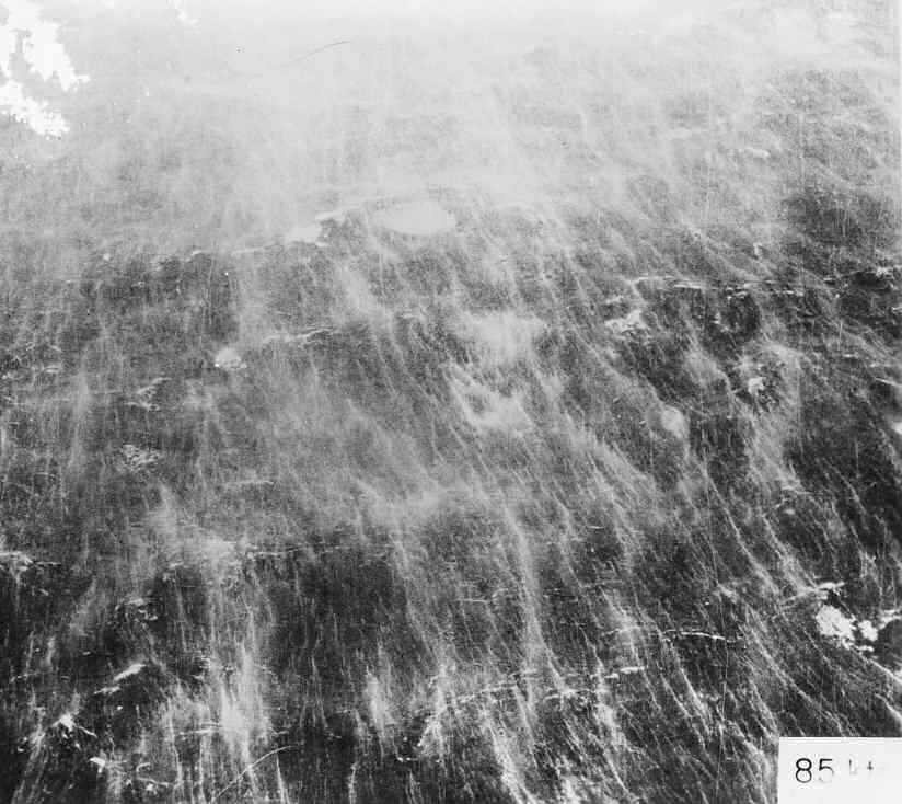 4th picture from the left: Sea state with surface winds of 25 Kts. At wind speeds of 23 - 28 Kts. Larger elongated waves form; numerous patches of white foam remain from breaking waves; wind streaks become still more noticable. ...The picture shows streaking probably caused by rubbing. -