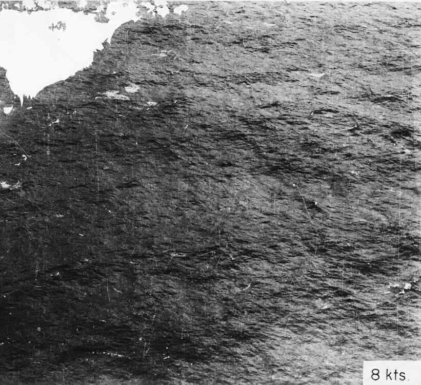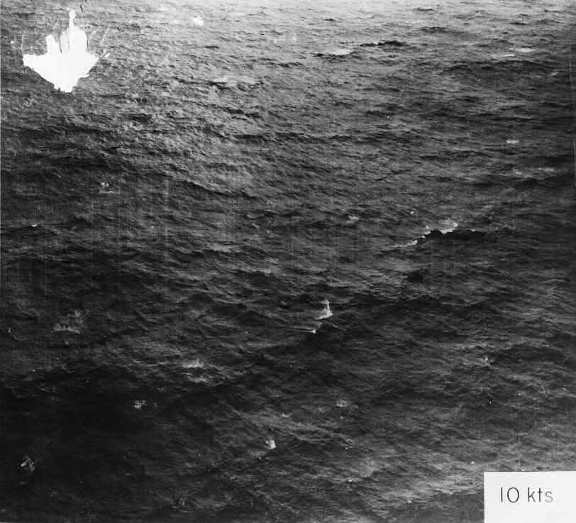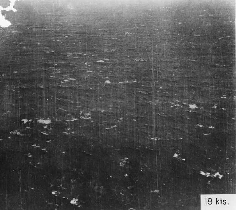 2nd picture from the left: Sea state with surface winds of 18 Kts. At 16 - 18 Kts slight traces of wind streaks parallel to wind directin begin to appear; whitecaps and small patches of foam cover entire sea. ...The picture shows some film damage in the upper left corner.