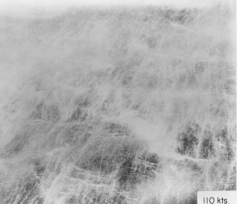 3rd. photo from the left: Sea state with surface winds of 40 Kts. At 36 - 42 Kts. blowing spray becomes more pronounced. Wind streaks appear very prominent but are not continous. ...The picture shows some film damage in the upper left corner.