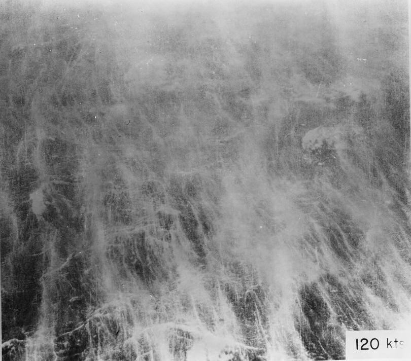 Sea state with surface winds of 100 Kts. At wind speeds over 100 Kts. the sea is completely white with blowing spray and foam, spray and foam assume tumbling, cascading appearence. ...The picture shows streaking probably caused by rubbing