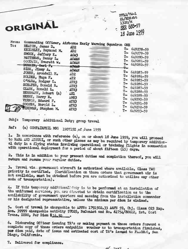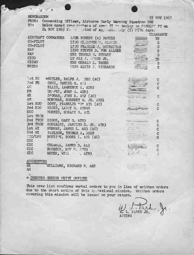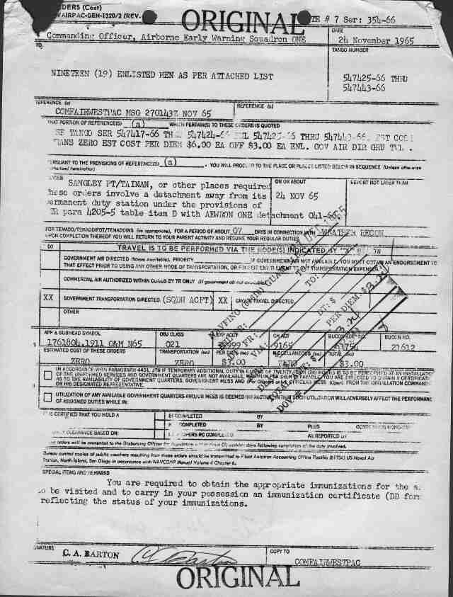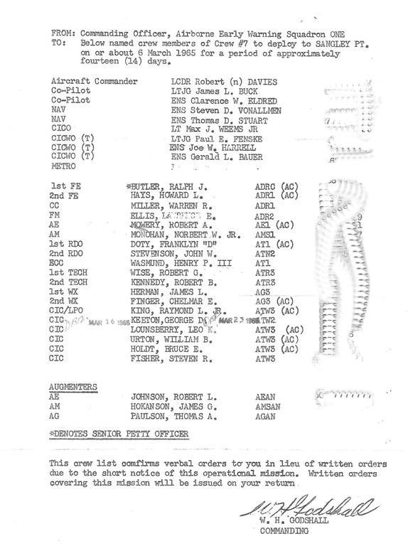 - TE-7 Flight crew Orders dated 9 Dec. 1965 to Sangley Pt. for fleet operations. Enlisted crew members