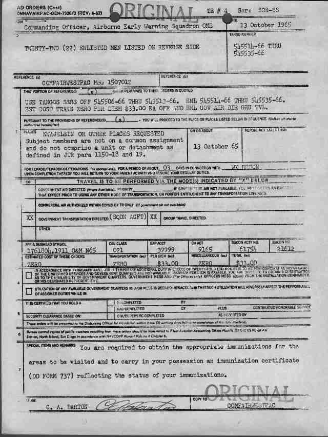 - TE-4 Flight crew Orders dated 13 Oct. 1965 to Kwajelein for weather recon. Enlisted crew members shown on