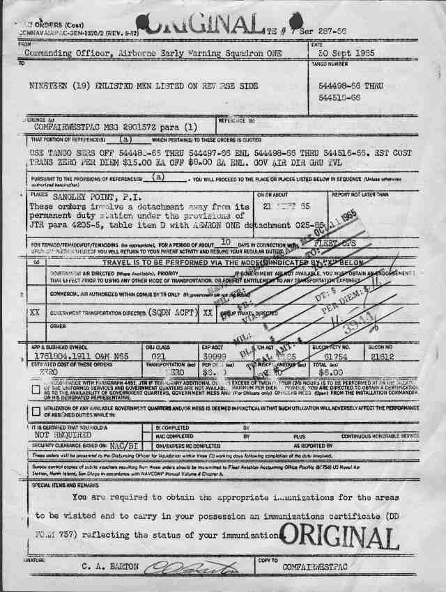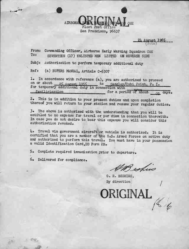 - TAD Orders for 25 Aug. 1965 for area familirization to Sangley Pt. and Cubi Pt.