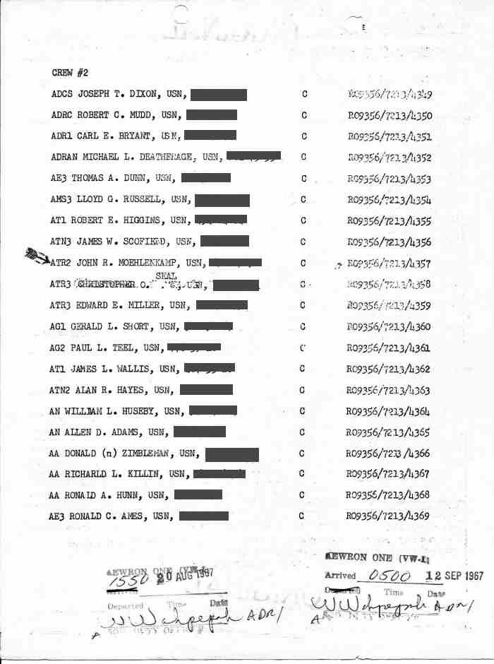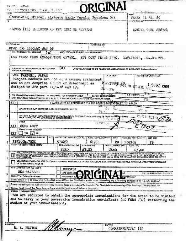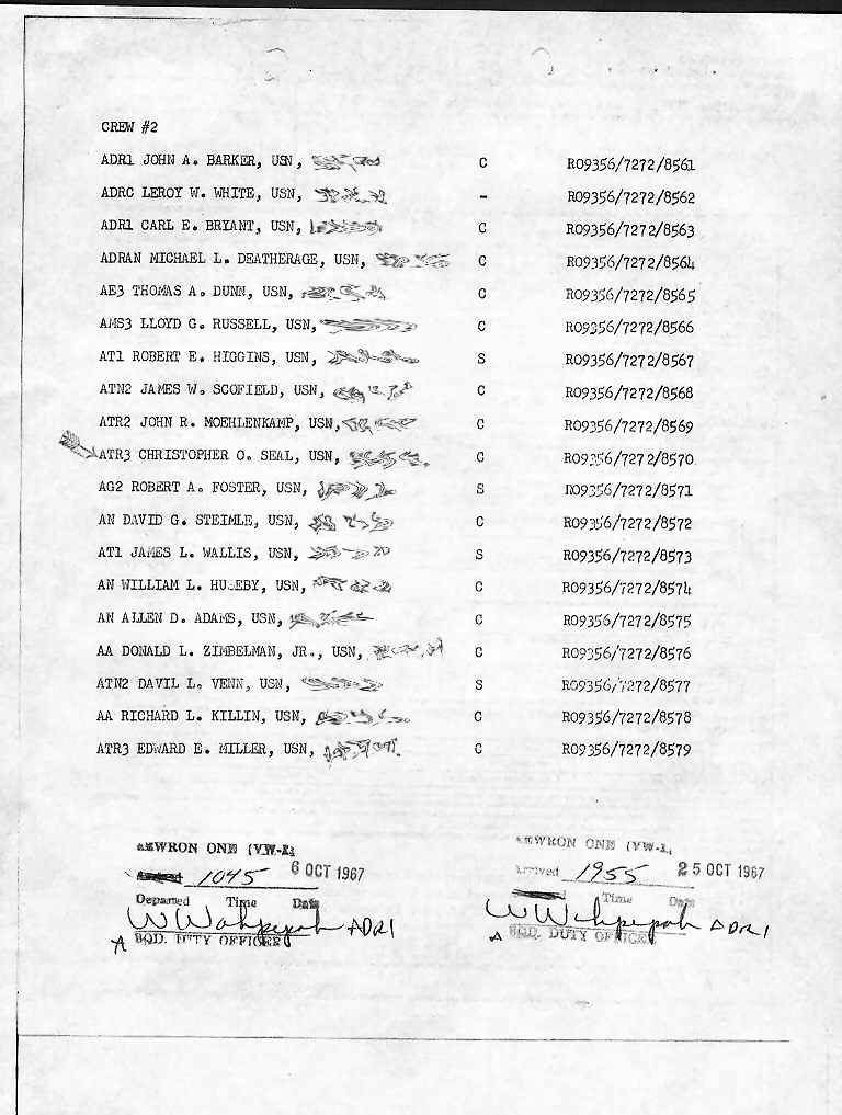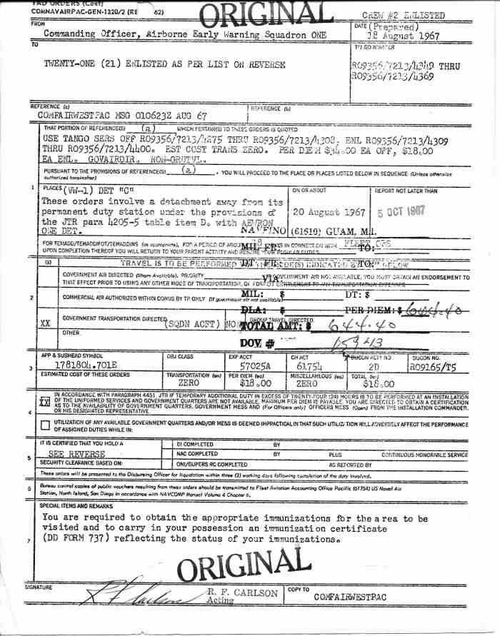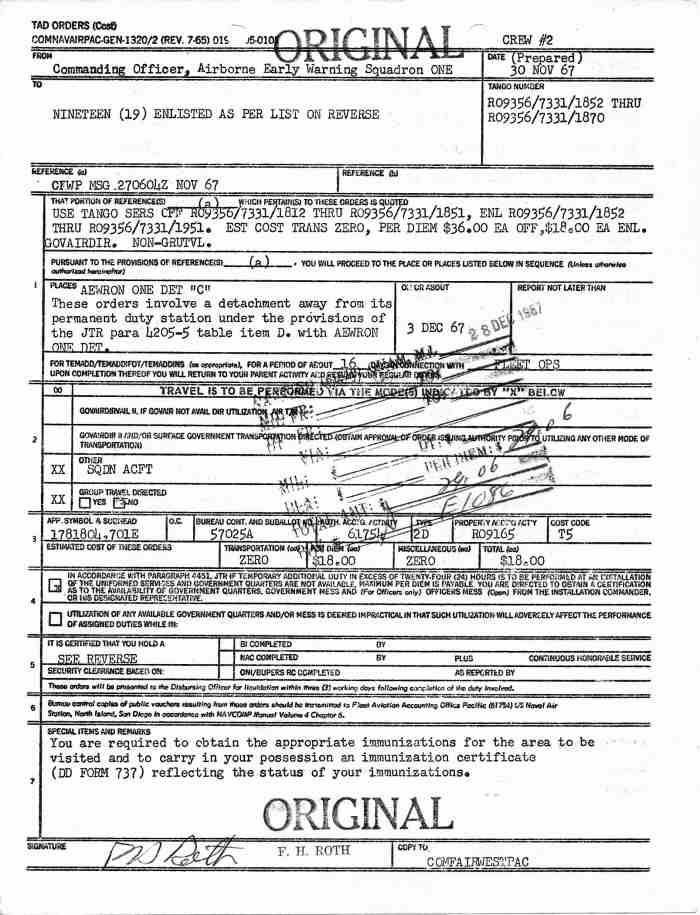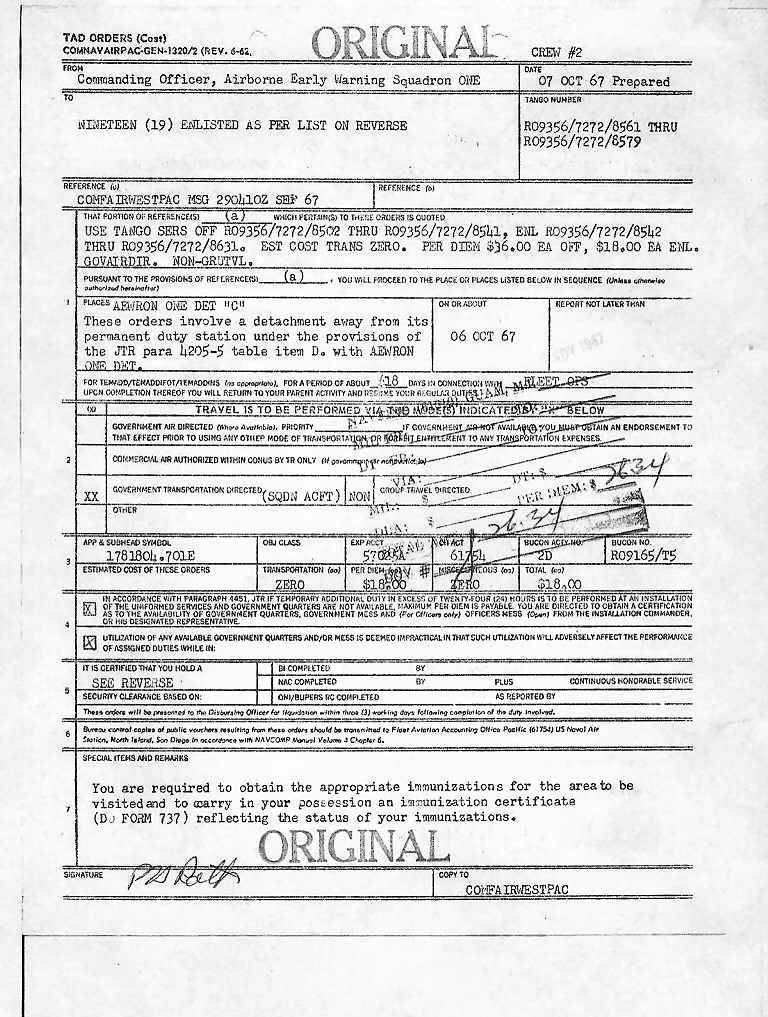- 1st. picture from the left: Flight crew #2 Orders dated 30 Nov 1967 TAD for 16 days as part of VW-1 Det.