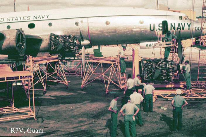 2nd picture from left: This photo of TE-7, one of VW-1's WC-121 Super Connies going through an engine change on